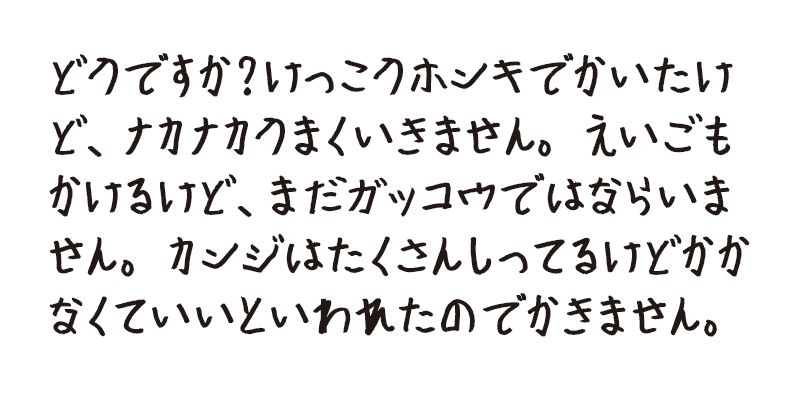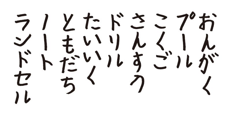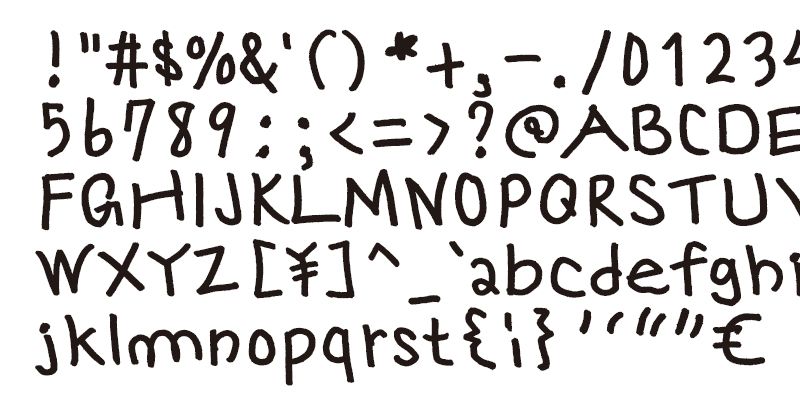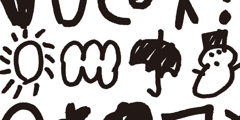 I designed this typeface based on a set of characters written by a first grade elementary student. The font includes only hiragana, katakana, numbers, Latin glyphs and some symbols.