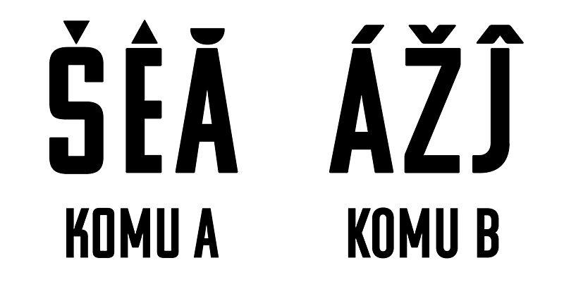 Komu consists of two styles. Version A is squarish and includes some distinctive characters (K, 5, narrow E, and idiosyncratic diacritics) while version B is rounded with mostly uniform widths (with the exception of E, F and L). The optical disparity of the original lettering style was retained, so that some of the characters look slightly darker than others.