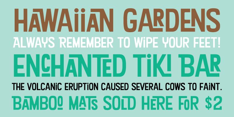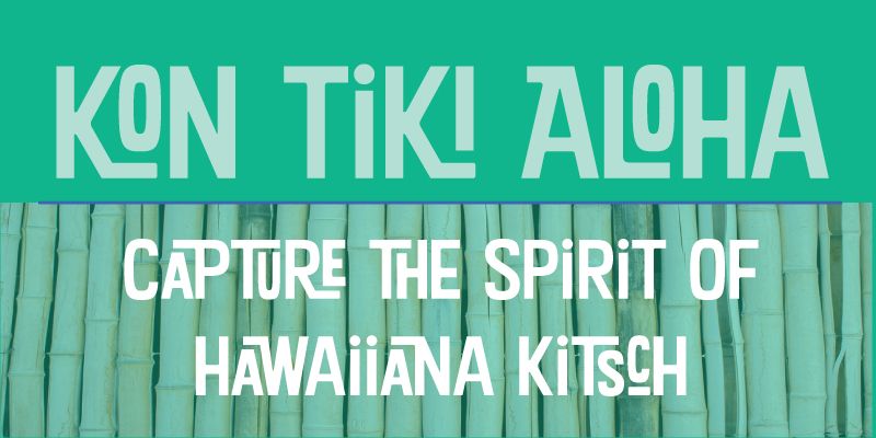Kon Tiki Aloha celebrates the design style of mid 20th Century Tiki kitsch. This font contains 120 alternate interlocking ligatures which can be found under the Discretionary Ligatures OT feature.