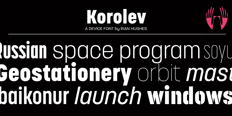 Based on an anonymous alphabet seen in photos of the Red Square Parades in the 30s, Korolev is a ruler-and-compass sans with an engineered elegance. The condensed weights and italics add up to a versatile family.