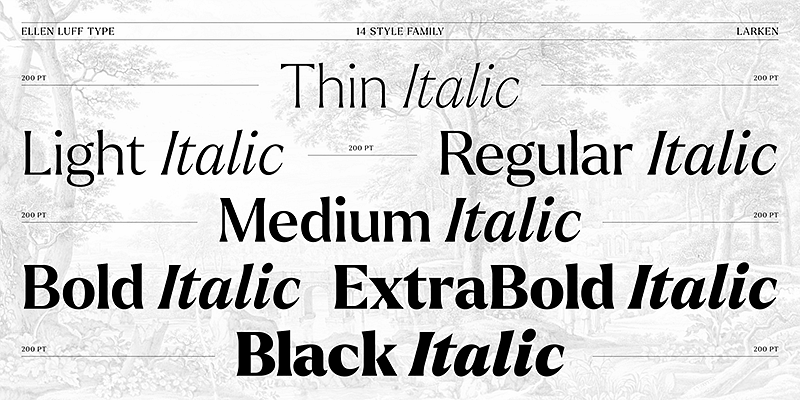 Ellen Luff Type Foundry offers a diverse and captivating range of thoroughly modern typefaces that cater to the distinguishing needs of designers, businesses, influencers, and creatives worldwide. Each meticulously crafted font in the collection — serif to sans, text to display — reflects Ellen’s passion for beautiful design and commitment to delivering top-notch solutions for modern typographic situations. Previous clients include Apple, NBC, Russian nut sellers, and remote bars in the Atacama Desert.
