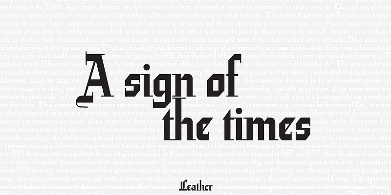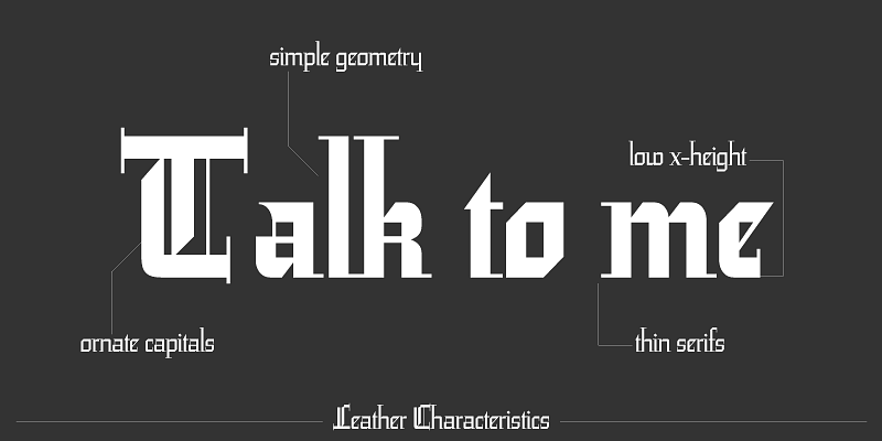 Leather is a retooling of Imre Reiner’s 1933 Gotika design, which was very much ahead of its time. Its fragility was problematic for printers at the time, but now it seems like it was made for current grid-based technologies.