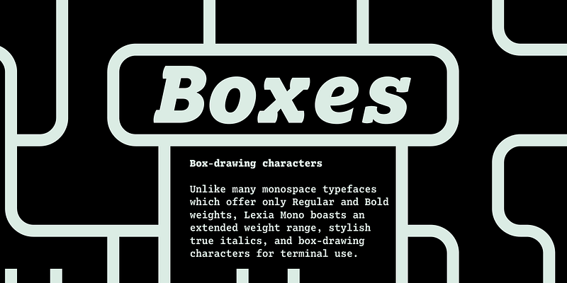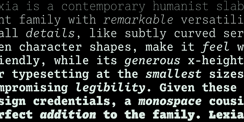 Lexia Mono, Lexia’s monospace cousin, was designed for programmers and those who work with tough compositional issues. Its clean, uninterrupted rhythm and even colour make it remarkably easy to read