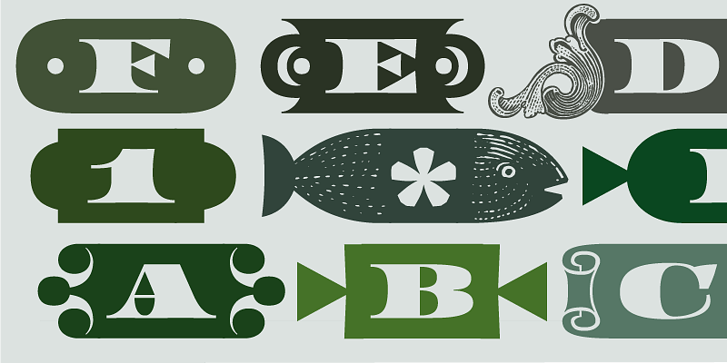 Federal Reserve Note is Federal Regular all wrapped up. Sometimes referred to as cameo or streamer, the boxed-in letterforms create eye-catching ribbons of text. Raise interest further with ten different end pieces: Crown, Toffee, Scroll, Oval, Engraved, Lunate, Crescent, Candy, Fish and Hotdog.