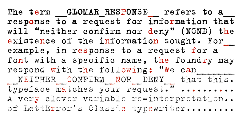 NCND (Neither Confirm Nor Deny) is the new name for the original dirty, digital typewriter face best-known from The X-Files. Now a variable font, this improved version interpolates seamlessly between even lighter and heavier extremes. A monospaced classic, it has an extended Latin character set as well as Greek and Cyrillic support.
