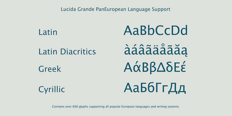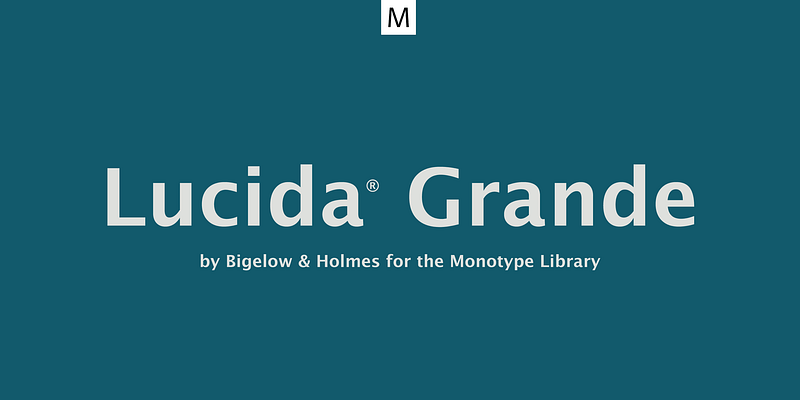 Lucida Grande is a humanist sans serif font with a large x-height, clear letterforms, and space-saving economy. Its easy reading qualities make it legible for printing and screen displays even down to small sizes. Lucida Grande is part of the Lucida superfamily of fonts from Bigelow & Holmes. Lucida is highly regarded for legibility and its extensive range of type styles. The Lucida Grande family has eight fonts with weights from Thin to Black with matching italics. Each font has 674 glyphs and supports the W1G character set. This includes Latin, Greek and Cyrillic alphabets to support many languages in Europe, the Americas, and worldwide.