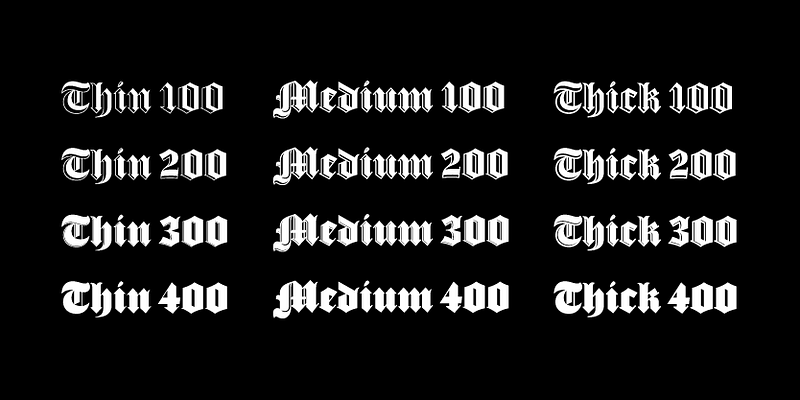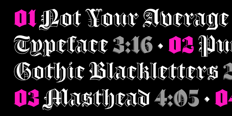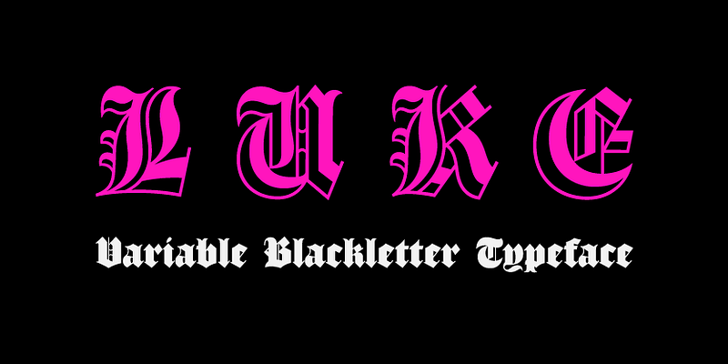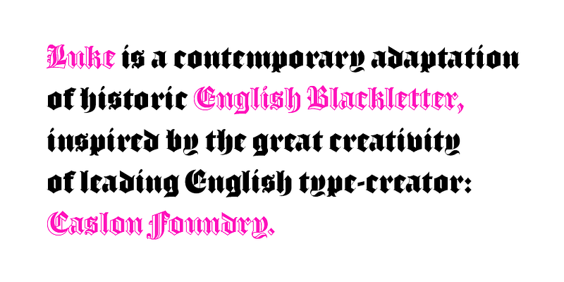 Luke is a contemporary adaptation of historic English Blackletter. This modern and versatile type family offers a wide range of styles. Details include 12 styles and 641 glyphs and 37 languages supported.