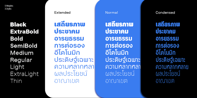 Manop is a typeface that Cadson Demak revived from LC Manop (Light Condensed Manop) from just a single weight to a Variable font (27 Styles). Manop is one of Manop Srisomporn’s most memorable typeface. Manop’s design was based off of distinctive characteristics from its predecessor. Manop also introduced alternate characters for users to pick and choose from in every weight. A system was also introduced to Manop to better organize the terminal endings. The designer has kept the original condensed proportion, along with its concealed loops which have been tweaked for usage on digital platforms.