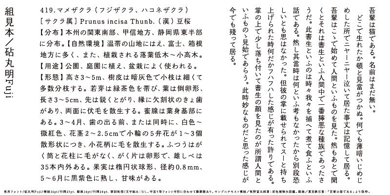 “Orthodox and gentle” - MaruminFuji’s kana characters are designed to feel established and relaxed with relatively large counter-spaces and a larger than average character size, closer to that of kanji characters, so the text aligns beautifully. The letter forms provide a soft, calm feeling. This typeface can be used for a wide variety of purposes.