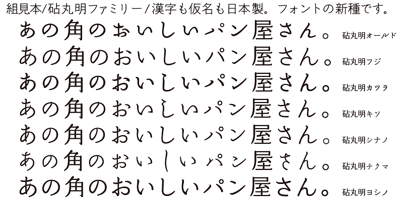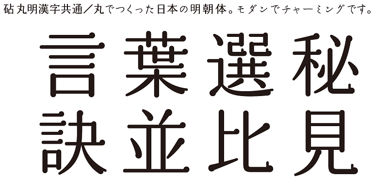 The same Ideographic (kanji) characters are shared by all the Marumin variations. The design of kanji characters of Marumin is based on the Mincho type style in Japan, but it has stroke elements with rounded features. The terminals of its horizontal and vertical strokes, dots, tome and harai stroke shapes are all rounded. Marumin establishes a new category of “Rounded Minchotai” with seven kana variations in total.