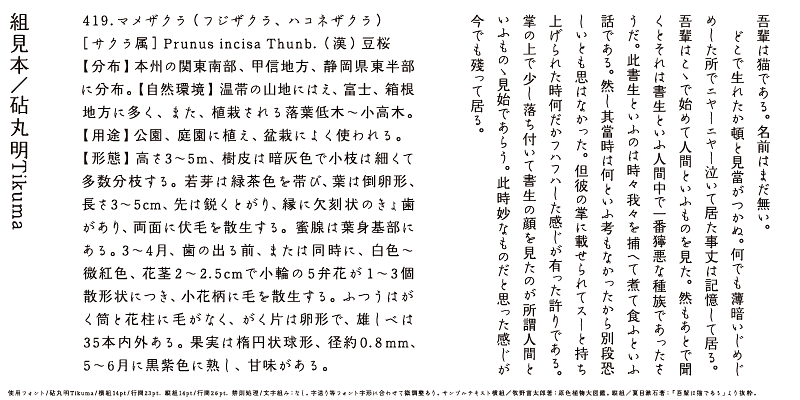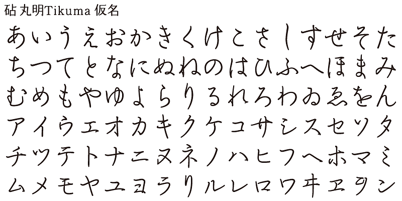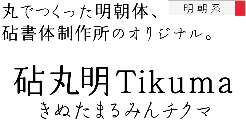 MaruminTikuma’s Kanji characters are lighter than its kana characters. It has the flavor of ancient calligraphy with fluid movement of strokes. The combination of elegant kana characters with curved elements and kanji characters with geometric shapes is boldly refreshing.
