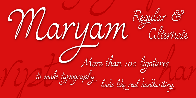 Maryam is a script type family designed by Ricardo Esteves. Because of moderate contrast, these fonts have ellegant and very legible forms even in small x-height sizes. There are more than 70 ligatures in each font, providing a lot of letterform variations that can make this type family look like real handwriting on a page.