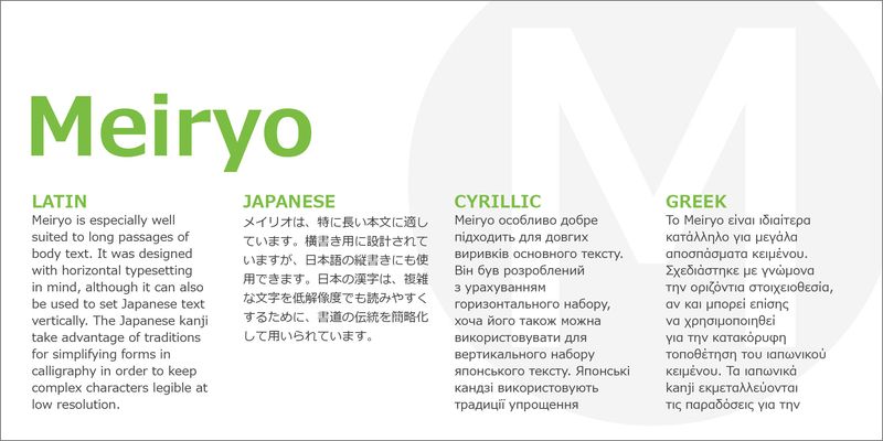 Meiryo was designed as one of Microsoft’s ClearType font collection in 2004. Type designer Eiichi Kono intended Meiryo to make reading onscreen easier in Japanese. The Japanese kanji take advantage of traditions for simplifying forms in calligraphy in order to keep complex characters legible at low resolution. The Latin, Greek, and Cyrillic letters in Meiryo was designed by Matthew Carter, who had previously designed Verdana for reading onscreen in Western languages.