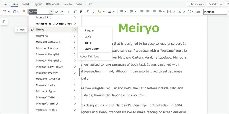 Meiryo has two weights, regular and bold; the Latin letters include italic and bold italic styles, though the Japanese has no italic.