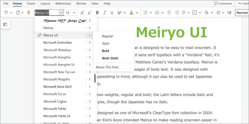 Meiryo has two weights, regular and bold; the Latin letters include italic and bold italic styles, though the Japanese has no italic.