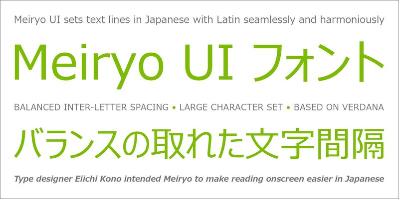 Meiryo is a Japanese typeface that is designed to be easy to read onscreen. It is a clean, simple, straightforward sans serif typeface with a “Verdana” feel; it’s Latin letters are in fact based on Matthew Carter’s Verdana typeface. Meiryo is especially well suited to long passages of body text. It was designed with horizontal typesetting in mind, although it can also be used to set Japanese text vertically.