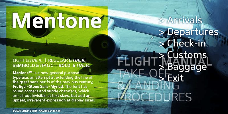 Mentone is a new general purpose typeface, an attempt at extending the line of the great sans-serifs of the previous century, Frutiger - Stone Sans - Myriad. The font has round corners and subtle chamfers, which are all but invisible at text sizes, but add an upbeat, irreverent expression at display sizes. The typeface is named after the beautiful bayside suburb of Melbourne, Australia, where the designer lived. That suburb is in turn named after Menton (Mentone in Italian), a town famous for its gardens on the French Riviera close to the Italian border.