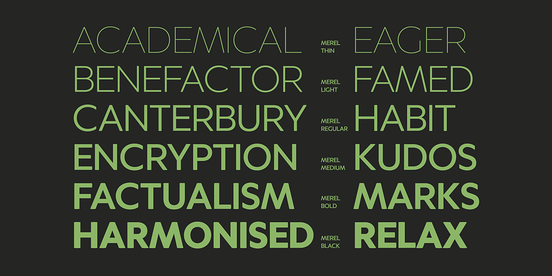 Merel is a modern geometric typeface with humanist attributes. Geometry and logic are at the heart of this 6 weight font family. Humanist touches give it a number of distinctive characteristics, as well as aid legibility. Despite being rational and function driven in its nature, Merel has a soft and gentle touch. It was designed to tackle both print and onscreen challenges of the modern environment. Details include reduced x-height, mild stroke contrast and vertically sheared terminals with cushioned finish across the typeface. Merel features a number of alternative characters, manually edited kerning and Opentype features.