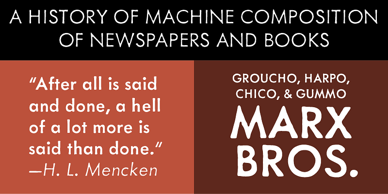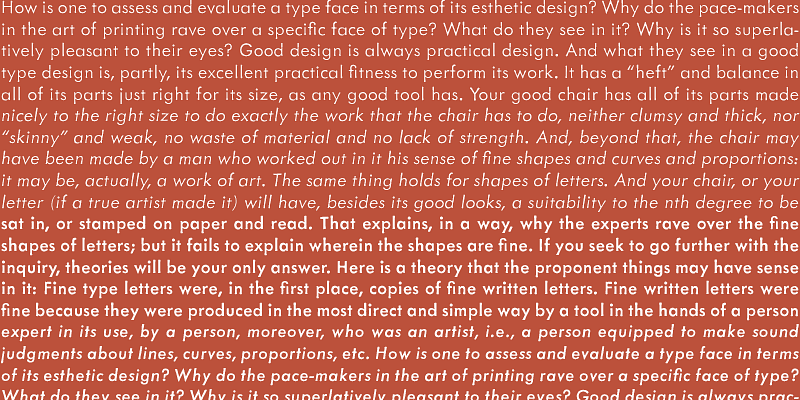 Metallophile Sp8 (2003, 2008) is a facsimile of 8-point sans serif type as set on a hot metal typesetting machine. The effect is very different from modern digital renditions of its cousin, Futura, which are coldly precise in and look quite different at text sizes. Hot metal faces were designed for specific point sizes, while modern digital faces take a one-font-for-all-sizes approach. Metallophile Sp8 captures much of the characteristic warmth of hot metal, which is particularly refreshing in such a geometric design.