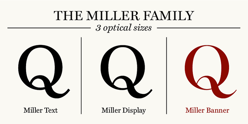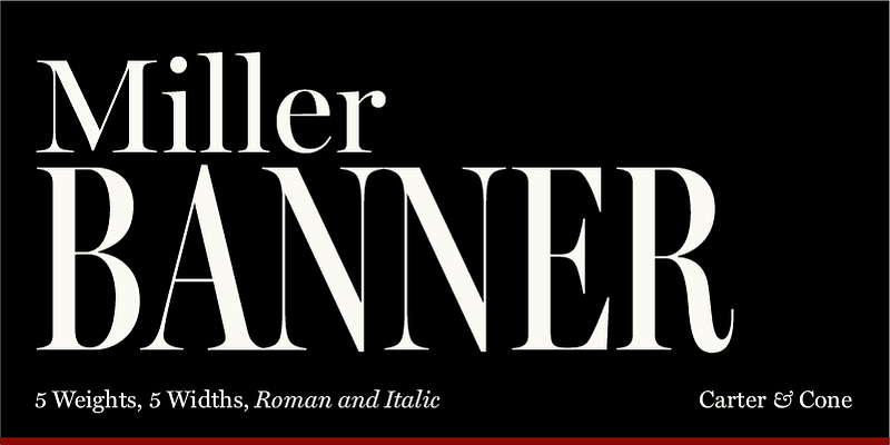 Miller Banner, the most dramatic curves within the Miller family, takes the series to new heights: 100 points and up! Matthew Carter optimized its extreme settings — hairlines sharpened, contrast sweetened — lending grace and gravitas to editorial headlines and fashion brands. Richard Lipton and Jill Pichotta of The Type Founders contributed in the expansion to give the family full range. Available in 5 widths and 5 weights, plus italics, Miller Banner has 50 styles for typographic trendsetting!