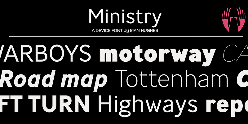 Based on the type used on British road signs from the 30s to the 60s, Ministry has an authoritative pedigree with the warmth and heritage of a traditional sans-serif.
