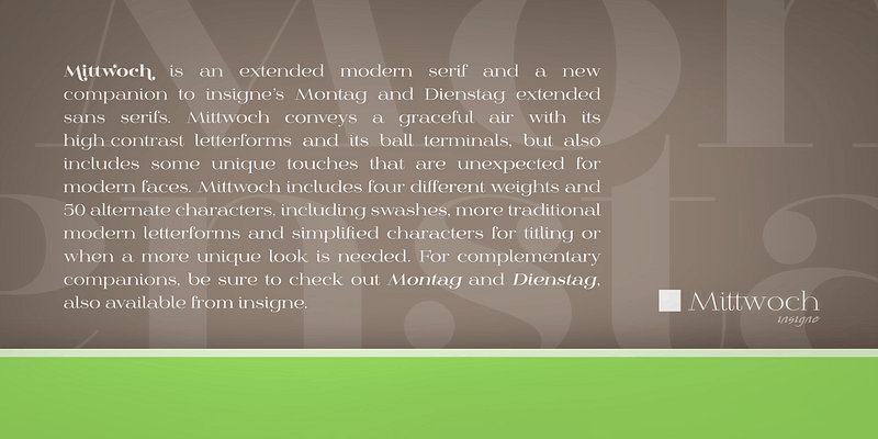 Mittwoch is an extended modern serif from insigne. It’s a new companion to insigne’s Montag and Dienstag extended sans serifs.