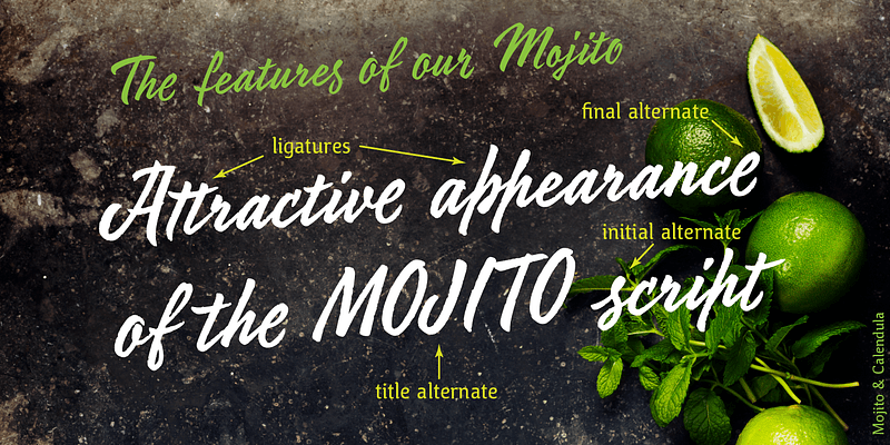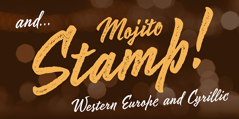 Mojito is a lively and vigorous calligraphic font based on a brush pen calligraphy. The author carefully rethought all of the character forms and created a very concise and clean outline that would look great in any size. Mojito has about 1,400 characters, including alternatives, ligatures, initial and final forms. That’s why letters are not repeated and their combinations look as natural as possible, especially in Cyrillic. For an all caps set in Mojito you can include the replacement of basic forms with the simplified ones, specifically designed for this purpose. Two additional styles imitate writing over a rough surface and a relief print. Mojito is perfect for packaging and advertising, food and beverages, cafes and restaurants, craftsmanship, children’s books, magazines, etc. The font was designed by Zahar Yaschin and released by Paratype in 2017. Additional styles were created by Alexander Lubovenko.