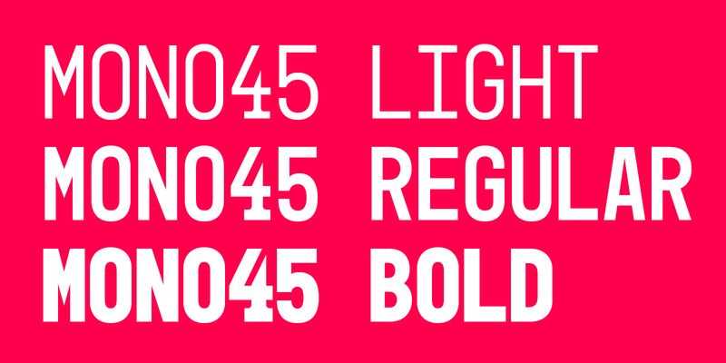 Mono45 Headline is an uppercase font which has got its origins in stamped tickets numbers issued by the University Hospital in Zurich for queuing up to get inoculated. It is thought to be a headline typeface and reminds with its strong character and rustic charm of old condensed poster typefaces and such used in factories or for industrial purposes.