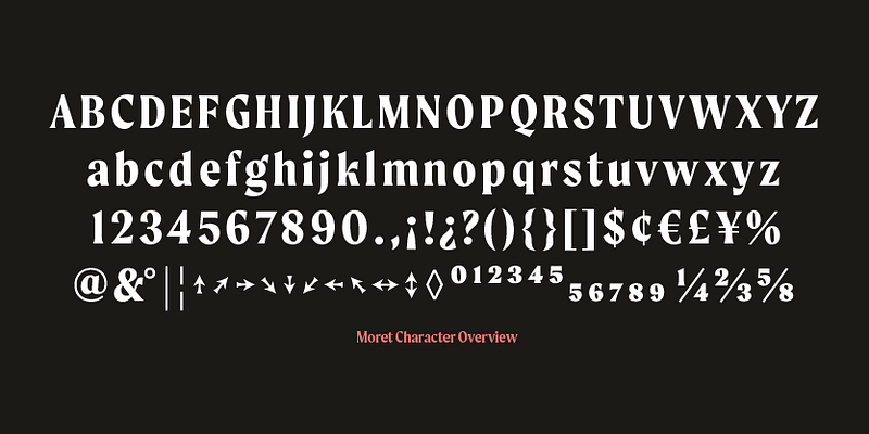 Moret is a serif display type family inspired by 20th century European sign painting. With 10 weights and 466 glyphs per font, Moret supports 94 different languages.
