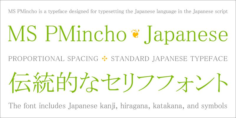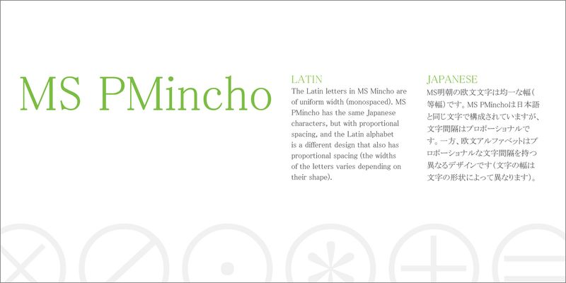 The Latin letters in MS Mincho are of uniform width (monospaced). MS PMincho has the same Japanese characters, but with proportional spacing, and the Latin alphabet is a different design that also has proportional spacing (the widths of the letters varies depending on their shape).