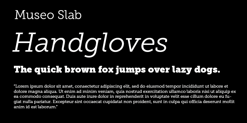 Museo Slab is the slab serif version of the well known Museo font family. It’s a robust slab serif with Museo’s friendliness. If you are looking for a modern edge, but want to retain legibility and clarity, Museo Slab is a good place to start.
