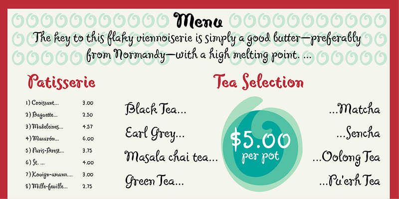 Kanna Aoki was designing fabrics and dishware for several major manufacturers when she designed MVB Cafe Mimi. The design came from a few words Aoki painted as decoration for a set of cappuccino cups. Aoki created the Regular weight for MVB Fonts using a brush. The Bold was adapted after digitization. Using several double-letter ligatures, the fonts can feel as natural and spontaneous as the original hand-painted lettering. Despite its curlicues and free-flowing forms, great care was taken to keep this script balanced and legible. It skips and hops along the baseline but doesn’t lose its step.