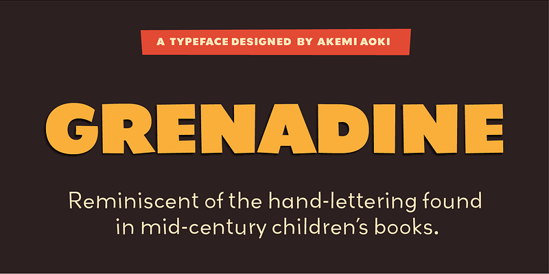 Reminiscent of the hand-lettering found in mid-century children’s books, Akemi Aoki’s MVB Grenadine is a quirky sans, broken free of its geometric roots. Letterforms bounce along the baseline in a jolly dance, yet remain clear and legible, whatever the reader’s age. MVB Grenadine is available in a broad range of six weights, each with italics.