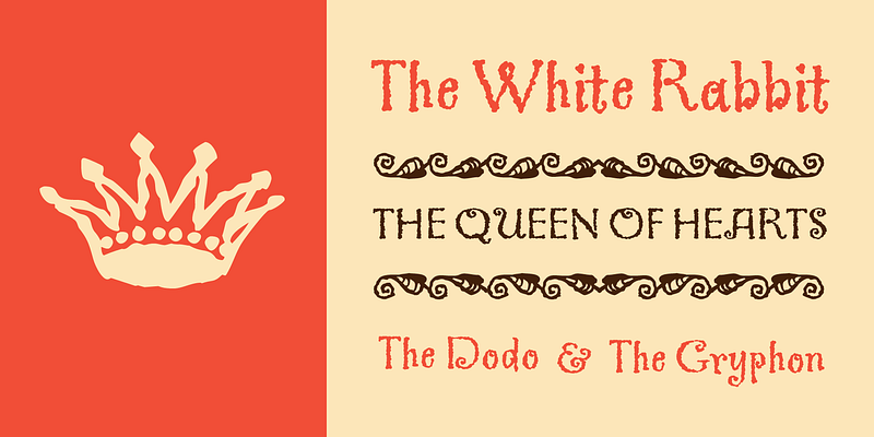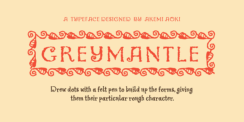 Kanna Aoki had fairy tales in mind when she designed MVB Greymantle. She drew dots with a felt pen to build up the forms, giving them their particular rough character. The “Extras” font contains a set of whimsical illustrations, including a portrait of Greymantle—her 18-pound cat, a set of curly initial caps, and border parts.