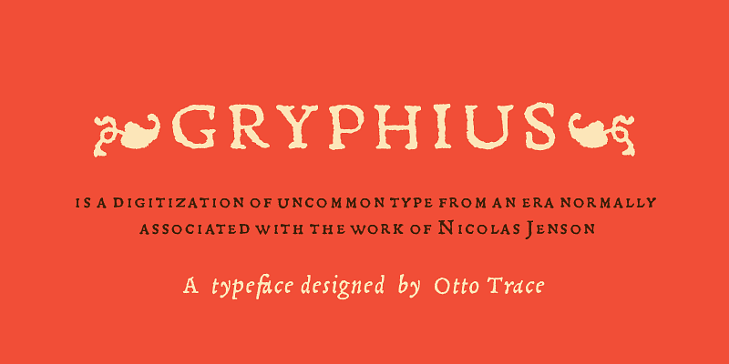 MVB Gryphius is a digitization of uncommon type from an era normally associated with the work of Nicolas Jenson. Produced by Otto Trace, the fonts come from types used by Sebastian Gryphius in Lyon in the early 16th century. The italic appears in a book from 1524 and the roman and small caps appear with the same italic in another book printed by Gryphius in 1541. Retaining the rough contours and uneven texture of its source, MVB Gryphius is best used at text sizes from 12- to 15-point, but its old world character can work in display settings too.
