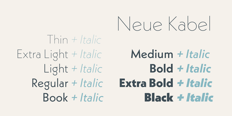 The Neue Kabel® typeface family, from Marc Schütz, takes the original charm of Rudolf Koch’s 1927 design and ushers it into the 21st century. It maintains the rhythm and proportions of Koch’s typeface, and adds the consistent design traits and family structure of a 21st century sans serif.