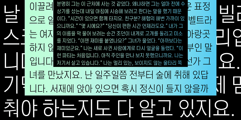 We designed the Latin and Hangeul fonts simultaneously. They complement each other vastly, making multi-script typography a breeze.