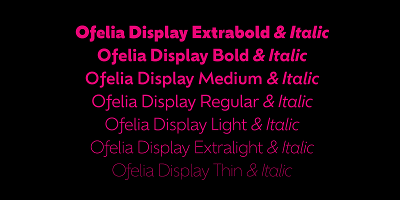 Ofelia is a geometric sans serif able to perform very well in almost any situation. It is a versatile family of fonts available in two optical sizes, Display and Text, with just the right amount of personality. Its geometric characteristics deliver neutrality while letters like /a /f and the comma provide it with a gestural touch. The fonts are equipped with small caps, old style and tabular figures as well as alternates for /a and /l