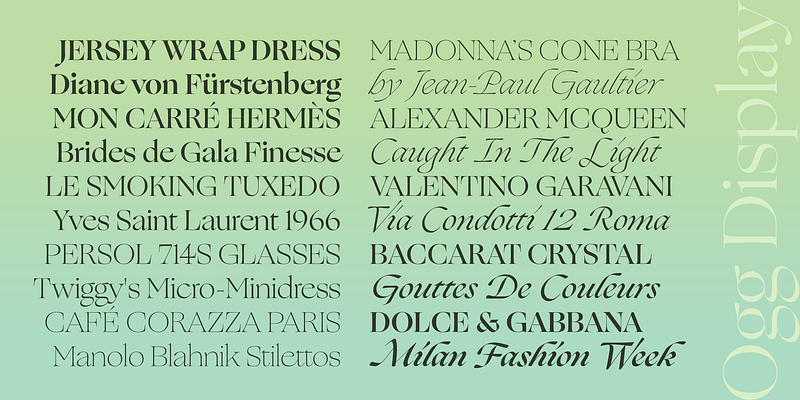 Inspired by the hand lettering of 20th century book designer and calligrapher Oscar Ogg, Ogg captures the unique mix of calligraphic and typographic form he achieved through his use of hand carved pen nibs, brushes, and white-out. Signature moves found throughout Ogg’s calligraphic works were explored, exaggerated, and refined in the high contrast design space of Ogg. The original lettering samples are a combination of calligraphic stroke, contour drawing, and white-out (reduction). This combination of calligraphic and constructed forms became the perfect jumping off point for typographic exploration.