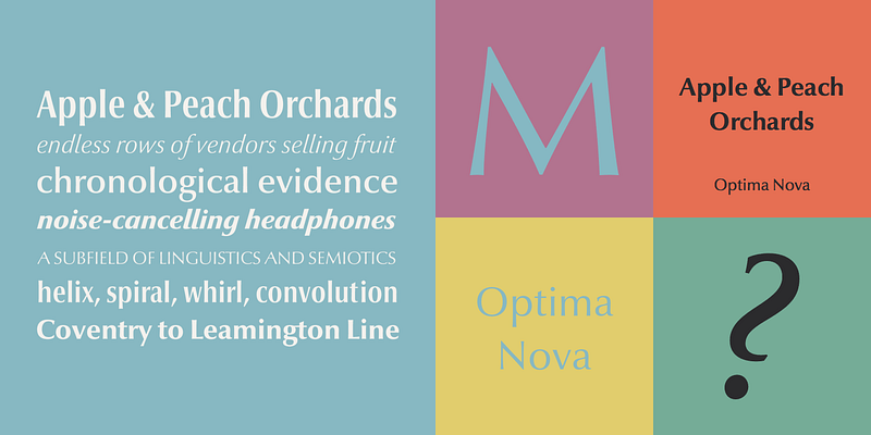 With the clear, simple elegance of its sans serif forms and the warmly human touches of its tapering stems, the Optima family has proved popular around the world. In 2002, when it was finally possible to produce digital alphabets without technical limitations and compromises, and more than fifty years after the first sketches, an expansion and redesign of the Optima family was completed and released as Optima nova. Hermann Zapf and Japanese type designer, Akira Kobayashi, collaborated on the project, which included re-working of the existing weights and the addition of several new weights: small caps, old style figures, light, heavy, and condensed. The original Optima was never manufactured with a real italic, only an oblique version of the roman. Optima nova has a complete range of beautifully designed real italics; the new italic forms, of the e, f and g are especially notable. The titling face includes capital letters with special and unusual letter combinations and ligatures, making it an excellent choice for headlines, logos and advertising purposes. Optima continues to be an all-purpose typeface; and Optima nova works for just about anything from book text to signage.
