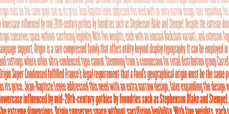 Despite the extreme dimensions, Origin conserves space without sacrificing legibility. With five weights, (each with an unusual Backslant variant), and extensive figure and language support, Origin is a rare compressed family that offers utility beyond display typography.