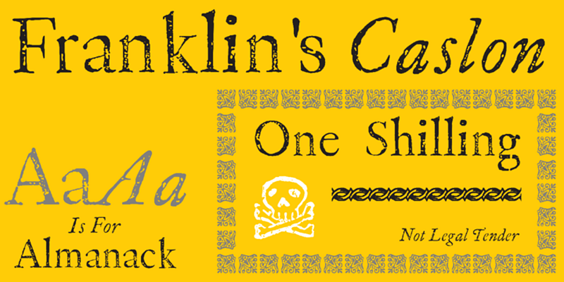 P22 Franklin Caslon includes letterforms digitized from images of impressions made by Benjamin Franklin and his printing office circa 1750, giving an authentic look of Franklin’s actual work.