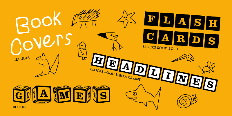 P22 ToyBox is a playful family based on a hand-drawn alphabet created by an honest-to-goodness five-year-old. Its naive, irregular forms bring a sense of wonder and spontaneity to the page. The fonts include charming letterforms, illustrated animals, and alphabet blocks in solid, bold, lined, and three-dimensional styles. Perfect for birthday party invites, educational materials, storybooks, or anything that calls for childlike energy and imaginative fun.