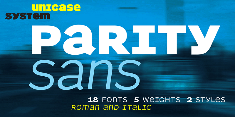 Originally conceived as a unique experiment (monowidth + unicase), Parity Sans has been expanded to include proportional fonts. Exceptionally for a unicase design, the extensive family enables complex hierarchies of functionality, with italics, six weights, and text and display styles.