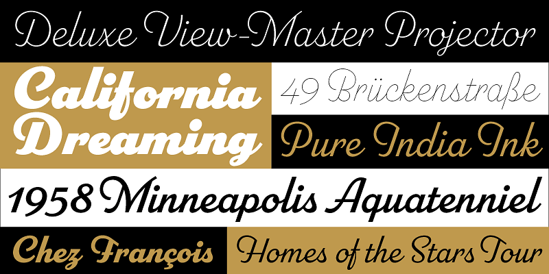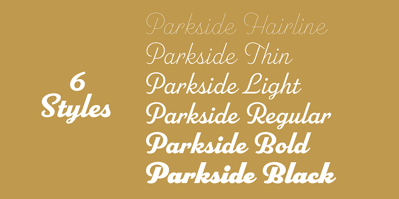 Parkside (2018) is a script typeface inspired by typefaces and lettering of the 1930s and 1940s. Unlike metal typefaces from that era, it takes advantage of modern digital typography, where letters may overlap and automatically change shape to better flow with surrounding letters. There are six weights (Hairlline, Thin, Light, Regular, Bold, and Black). Parkside has extensive language support, covering most Latin-based writing systems. Parkside uses OpenType magic to automatically select letter variations that seamlessly connect to the letters coming before and after.