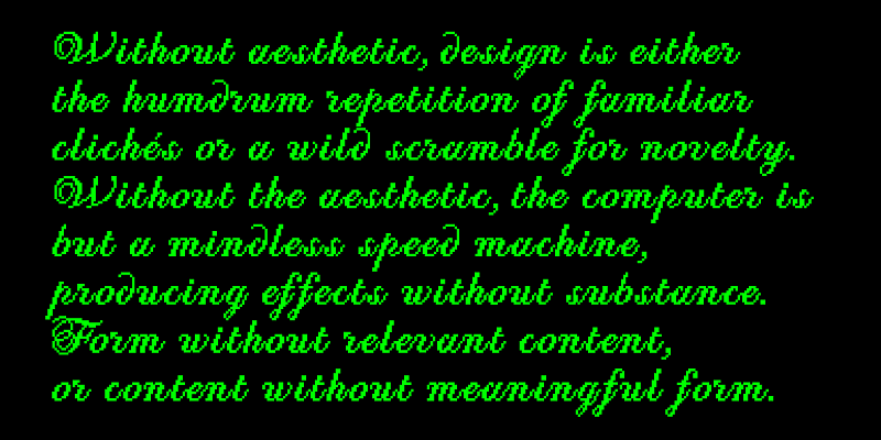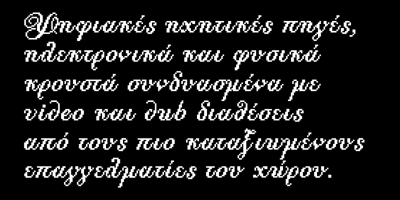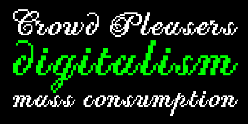 Pixelscript is a unique script pixel font which was carefully designed to be quite legible in web applications. Based on an earlier Parachute typeface, this is the only script pixel font that covers a wide range of languages and scripts like Latin, Greek and Cyrillic. Its large size (10x7 pixels) makes it suitable for titles. You may even use it for long legible text. Alternately use Photoshop to create gif icons for titles and/or web buttons. Finally you may use it in print applications at various sizes to create that extra digital aesthetic.
