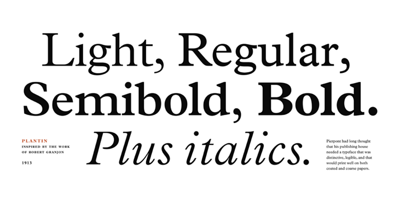 Designed for the Monotype Corporation in the early 1900s by F.H. Pierpont, Plantin is named for the sixteenth-century Antwerp printer Christophe Plantin. Although not based directly on his work, the model for Plantin was taken from the huge collection of type Plantin had procured. Like Times Roman, this typeface was designed to conserve paper: it has a large x-height and appears slightly condensed. Plantin is a fine text face for books, journals, and textbooks.