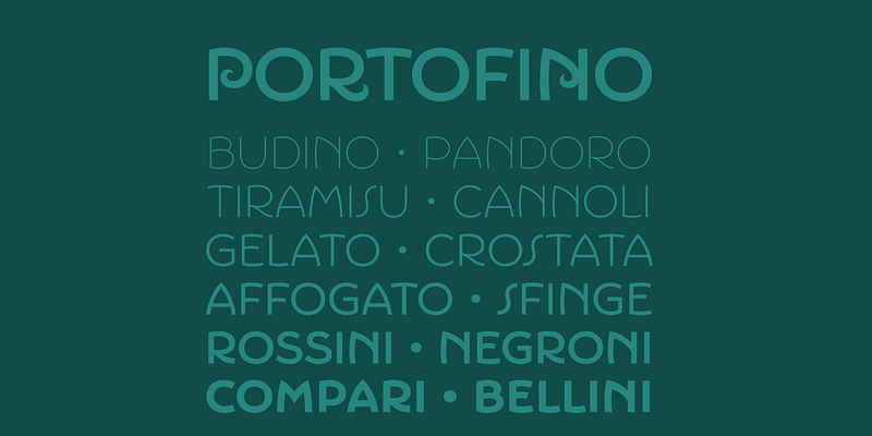 Influenced by Italian hand-lettered posters from the early twentieth century, Portofino is a charming display typeface with expressive forms complementing its underlying geometric proportions.