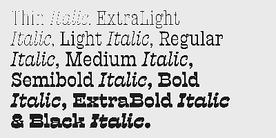 Presley Slab’s personality has breadth; it is a fun, confident and contemporary palette of letters that will perfectly perform for any job, from editorial design to branding. The Extra Bold and Black weights are a powerful option at large sizes for use on posters and billboards; the graceful Thin and Extra Light weights are delicate options for packaging design or fashion branding. Despite it conjuring images of mid-century music halls, Presley Slab is also staunchly European in its aesthetic, offering everything from good-humour to elegance with its unique touches.