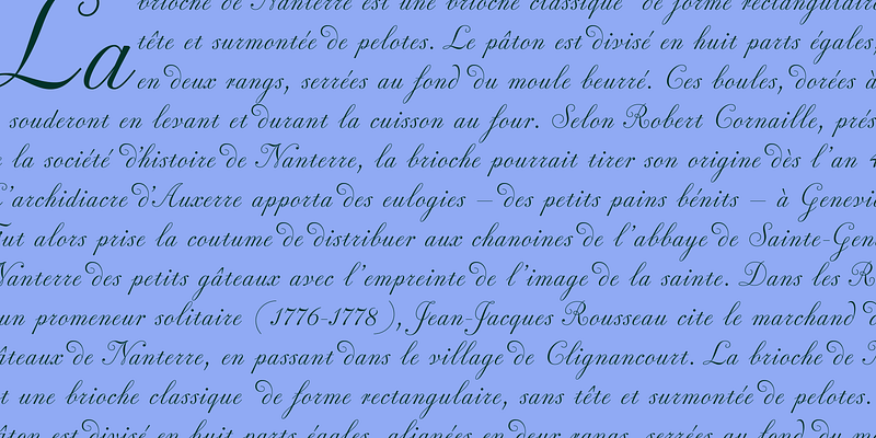 Pritzious is a flamboyant script typeface based on Rosart’s and Fleischman’s ‘Financière’ style of script types.